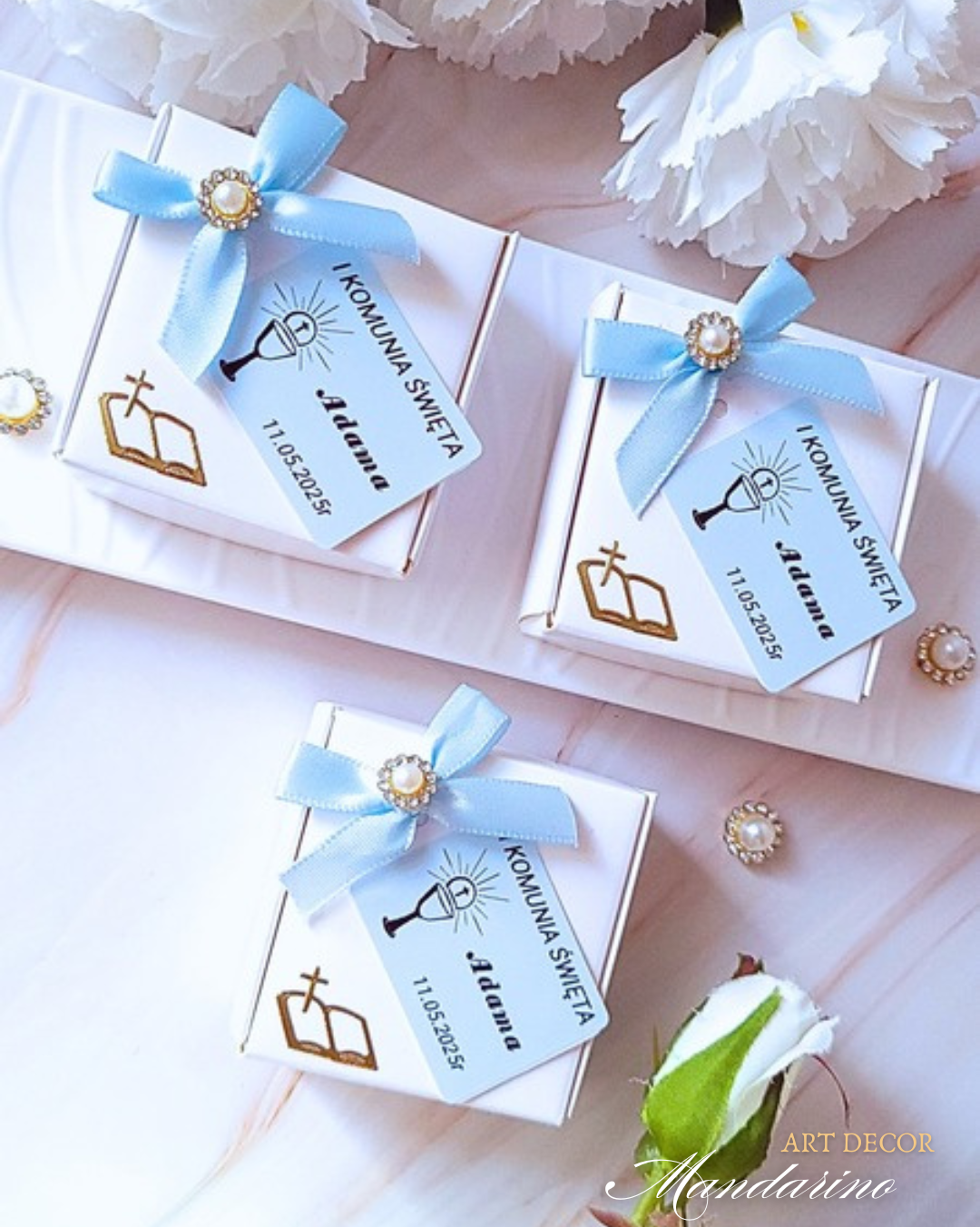 • W cenie wliczone jest: pakowanie w białe pudełko z kokardą (Niebieską lub Biała) i perłą + personalizowane zawieszki (z Imieniem oraz Datą Uroczystości).