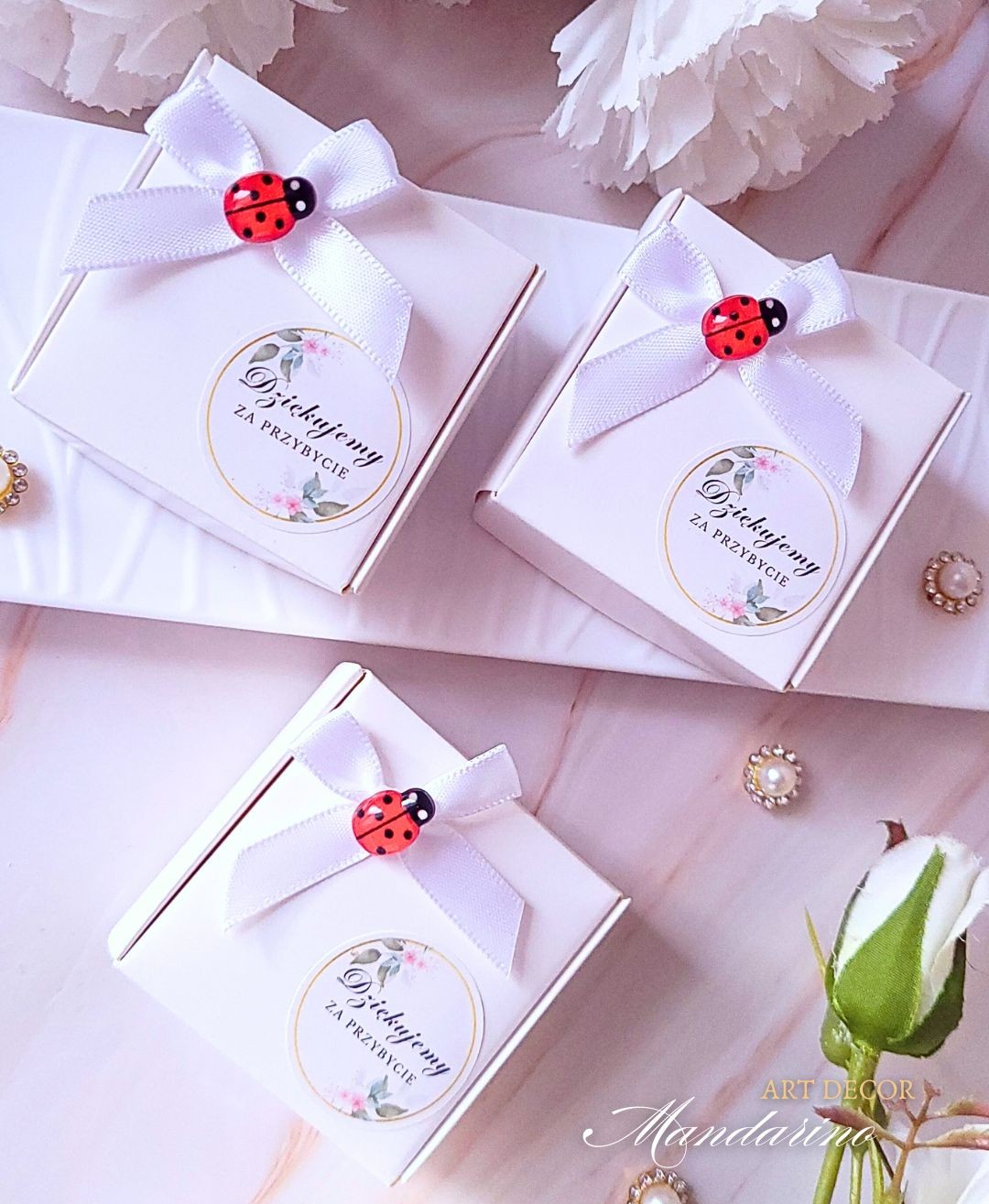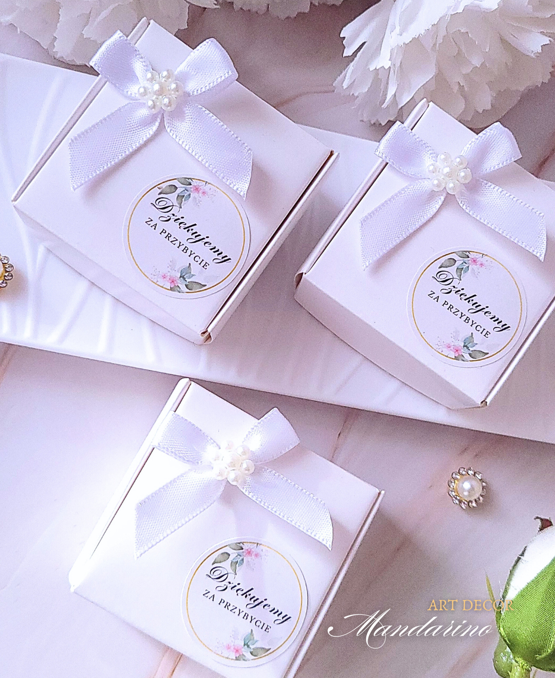 • WERSJA 1 – pudełko z białą kokardą z perłą + naklejka „Dziękujemy za przybycie”