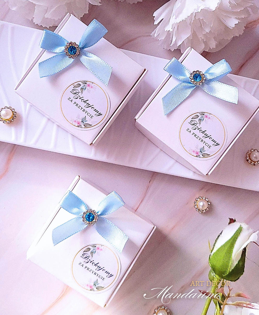 • WERSJA 2 – pudełko z niebieską kokardą i cyrkonią + naklejka „Dziękujemy za przybycie”