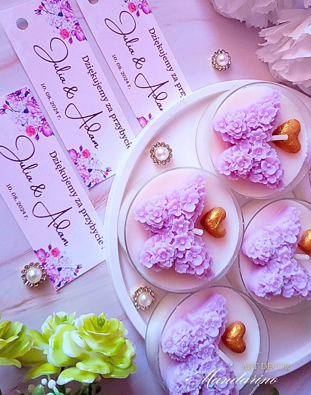Świece „Motyl” (wersja wrzosowa) na podziękowania Wesele