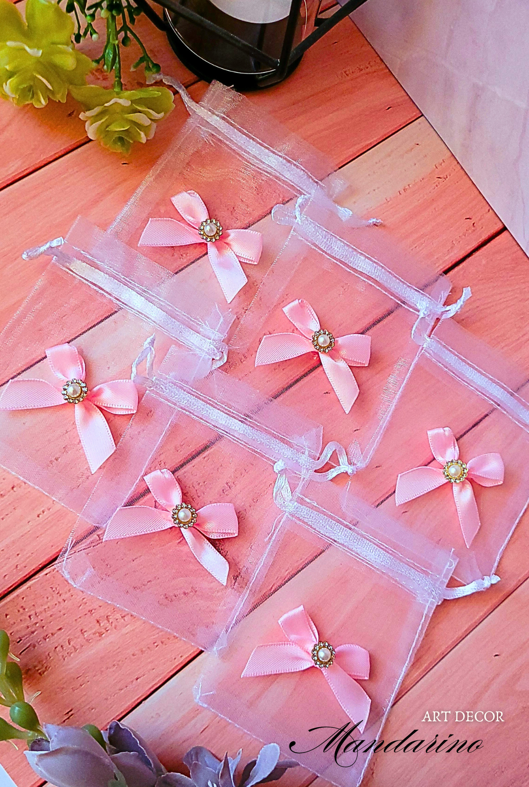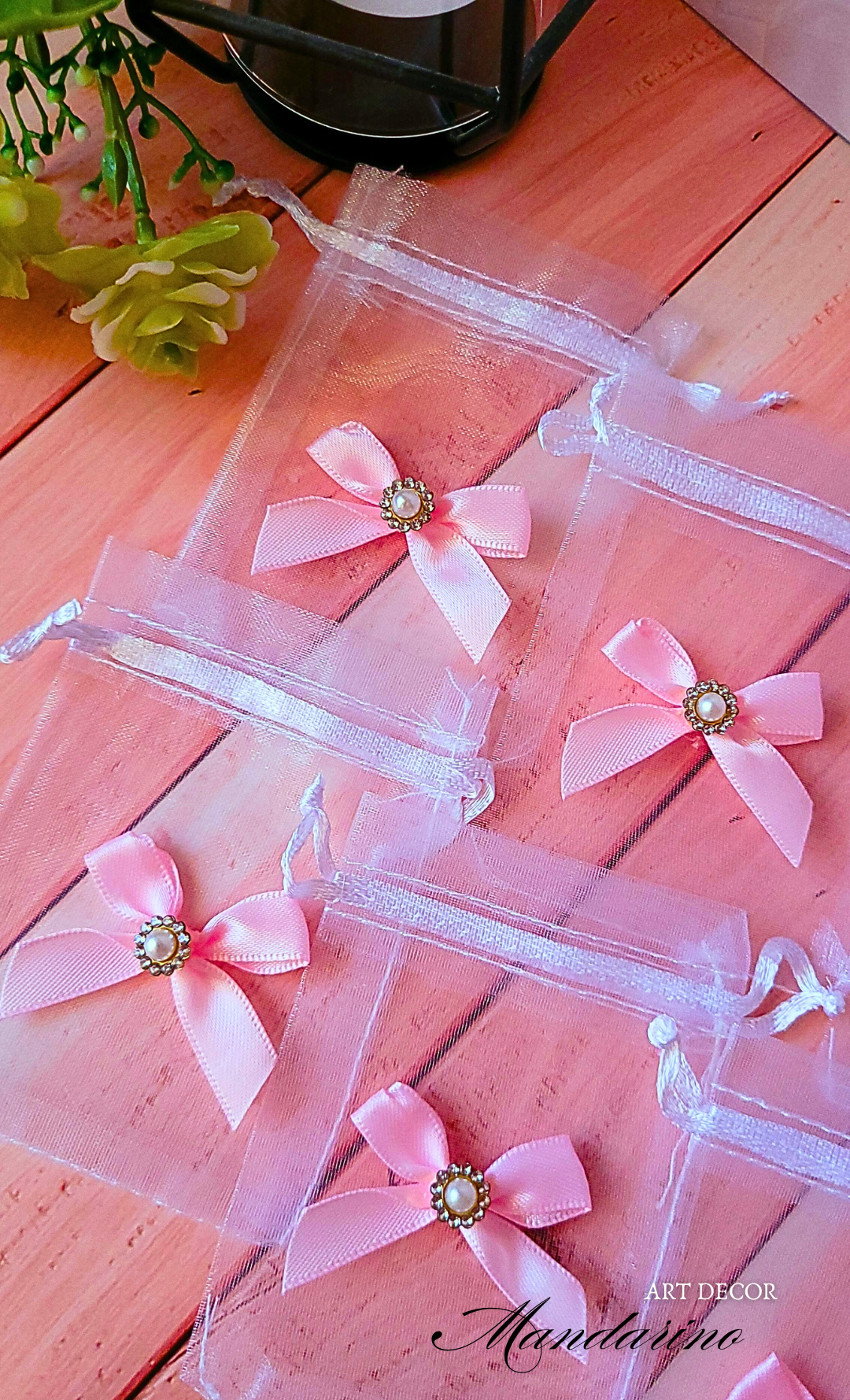 Woreczki prezentowe organza z różową kokardą